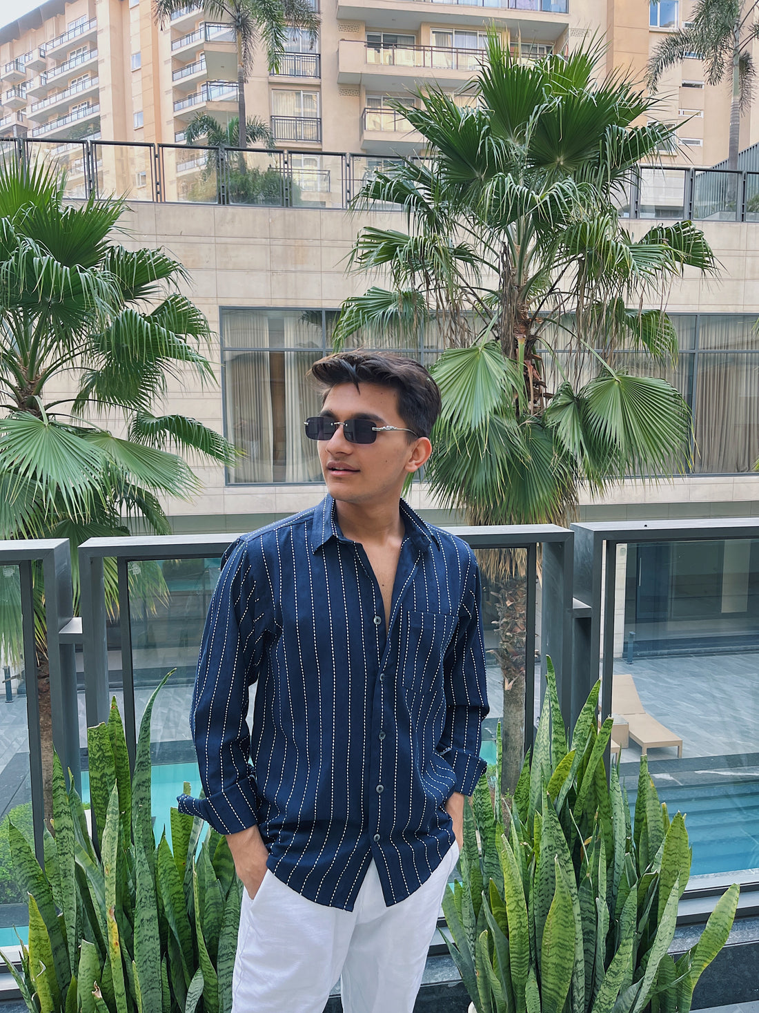 With subtle dotted stripes on a deep navy base, this shirt offers a refined twist...