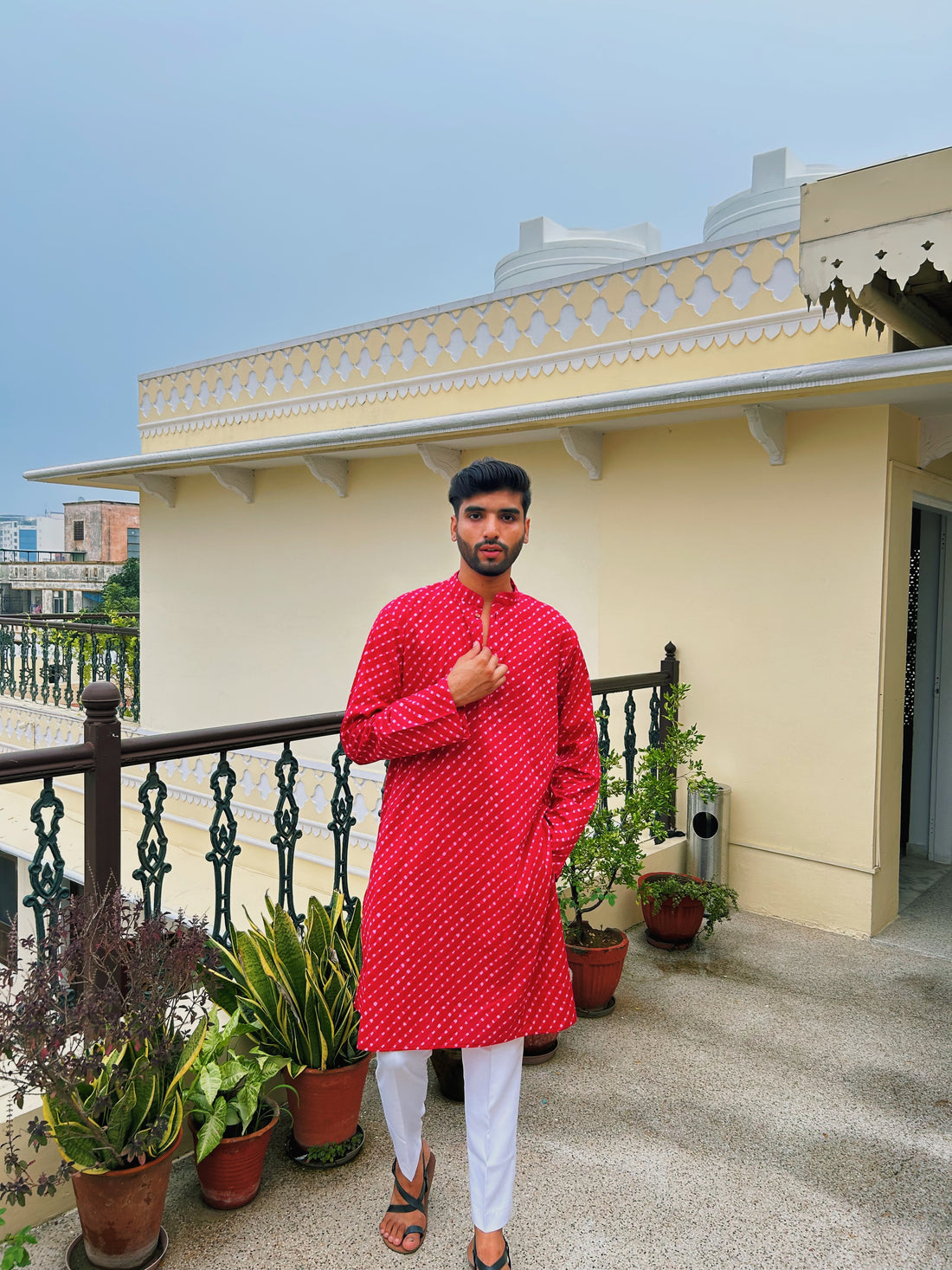 Step into festive elegance with our Rangreza Kurta, crafted in a vibrant shade of red...