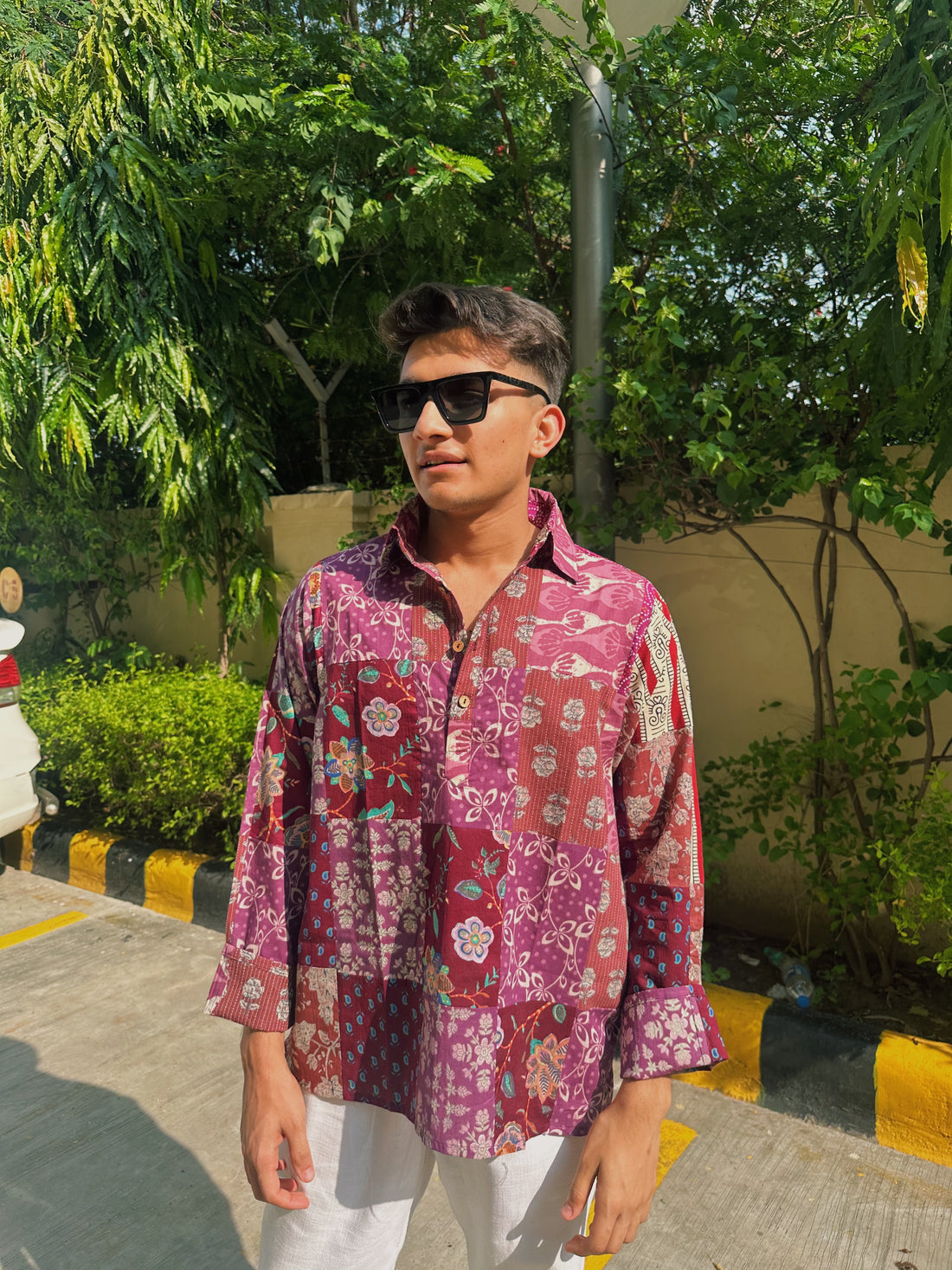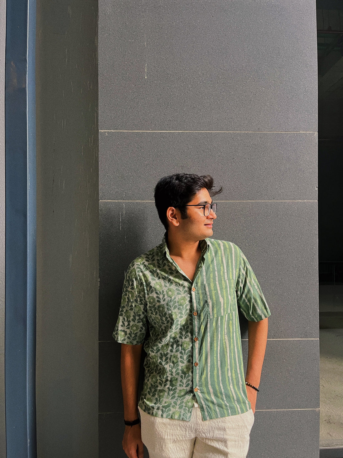 A bold take on traditional patterns, this half-sleeve cotton shirt merges two distinct block prints...