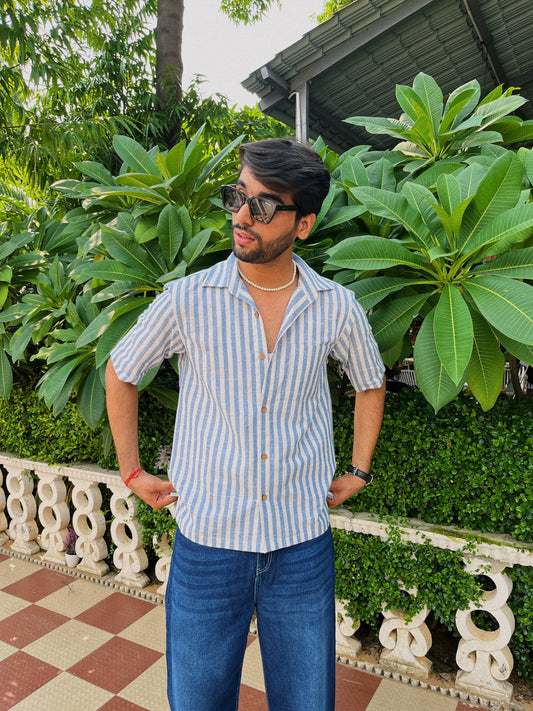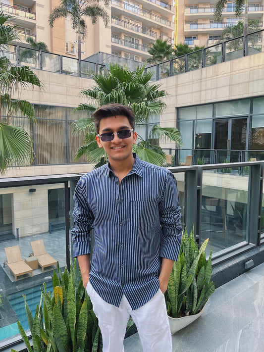 A bold navy and white striped shirt with a crisp design, inspired by nautical aesthetics....