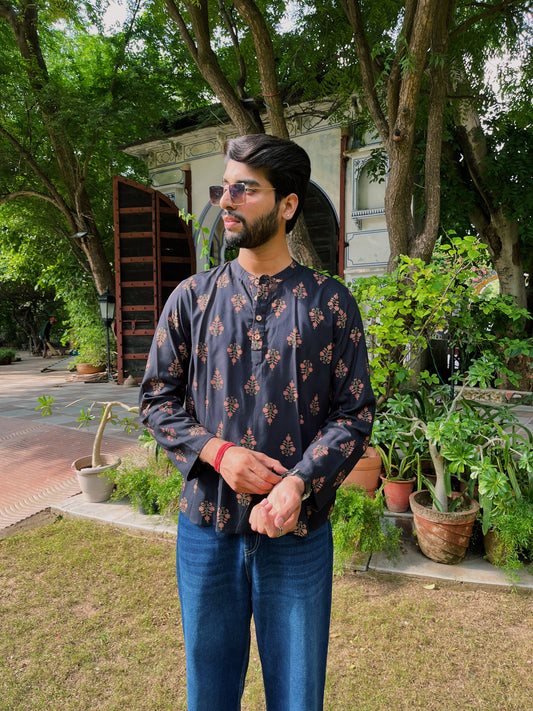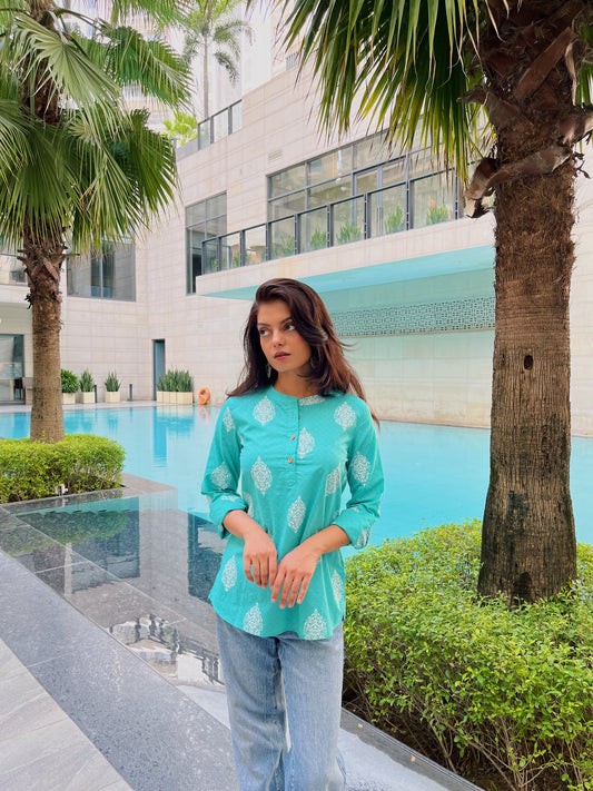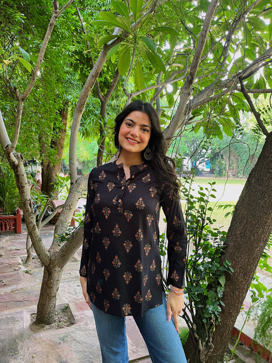 A short kurta crafted from cotton fabric, featuring a screen print design, mandarin collar, and...