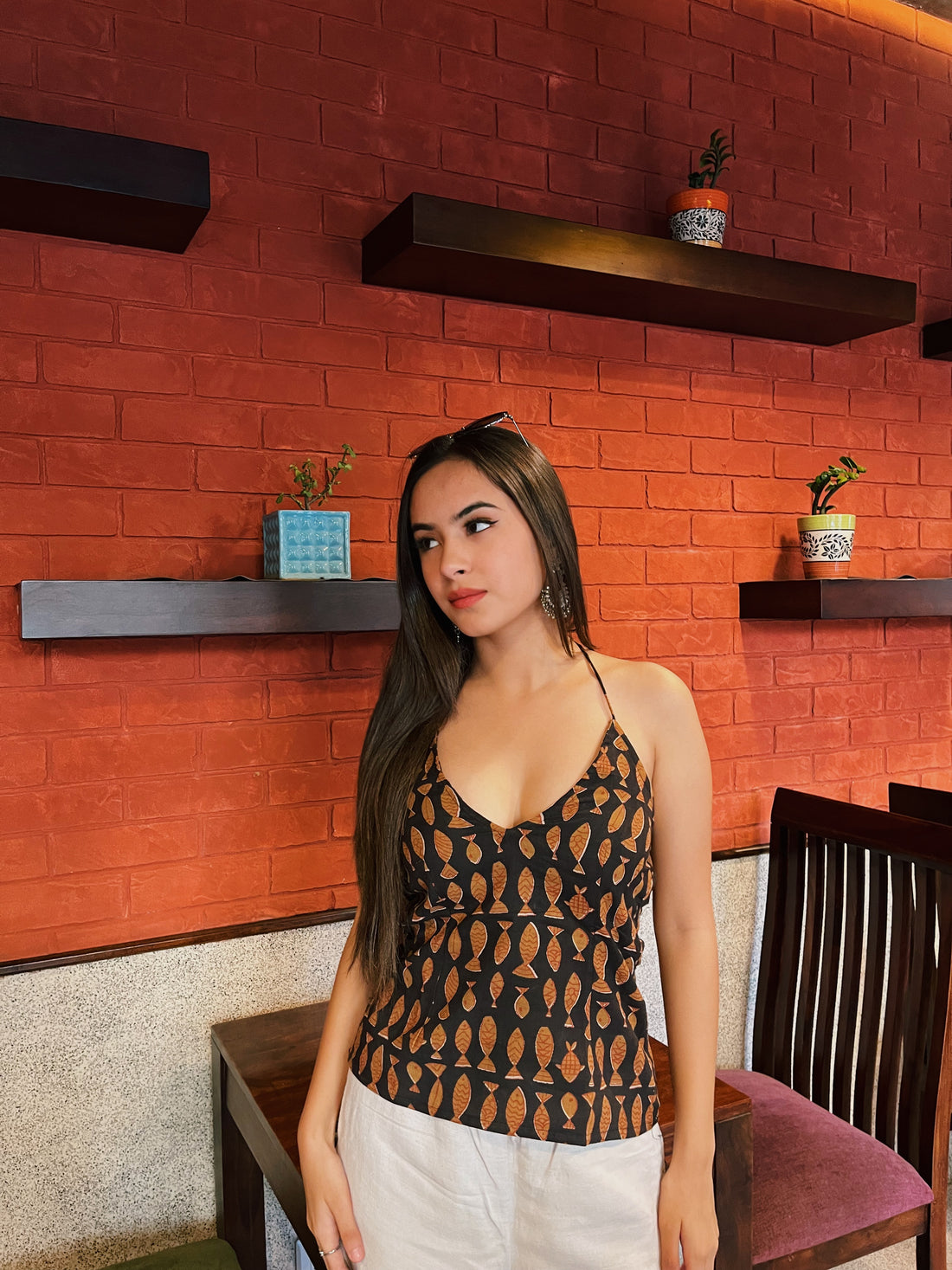 A bold black base adorned with ochre fish motifs, this top brings tribal and earthy...