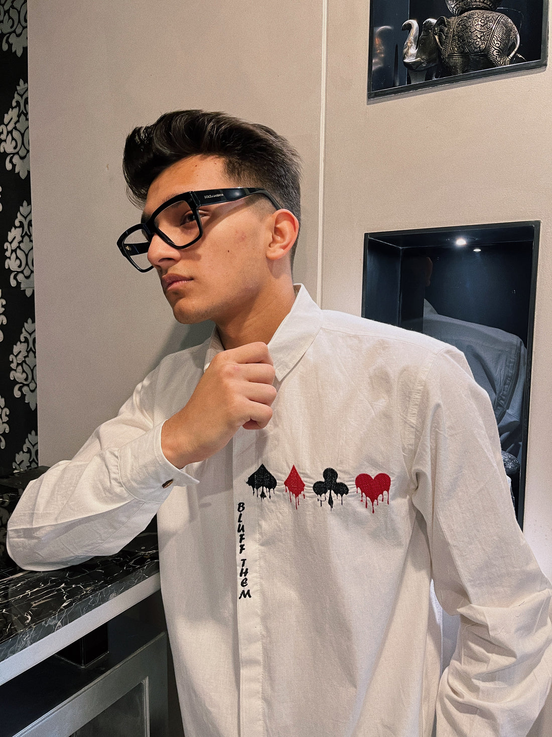 This shirt features a bold and stylish embroidery design, a playful card-suit motif, including spades,...