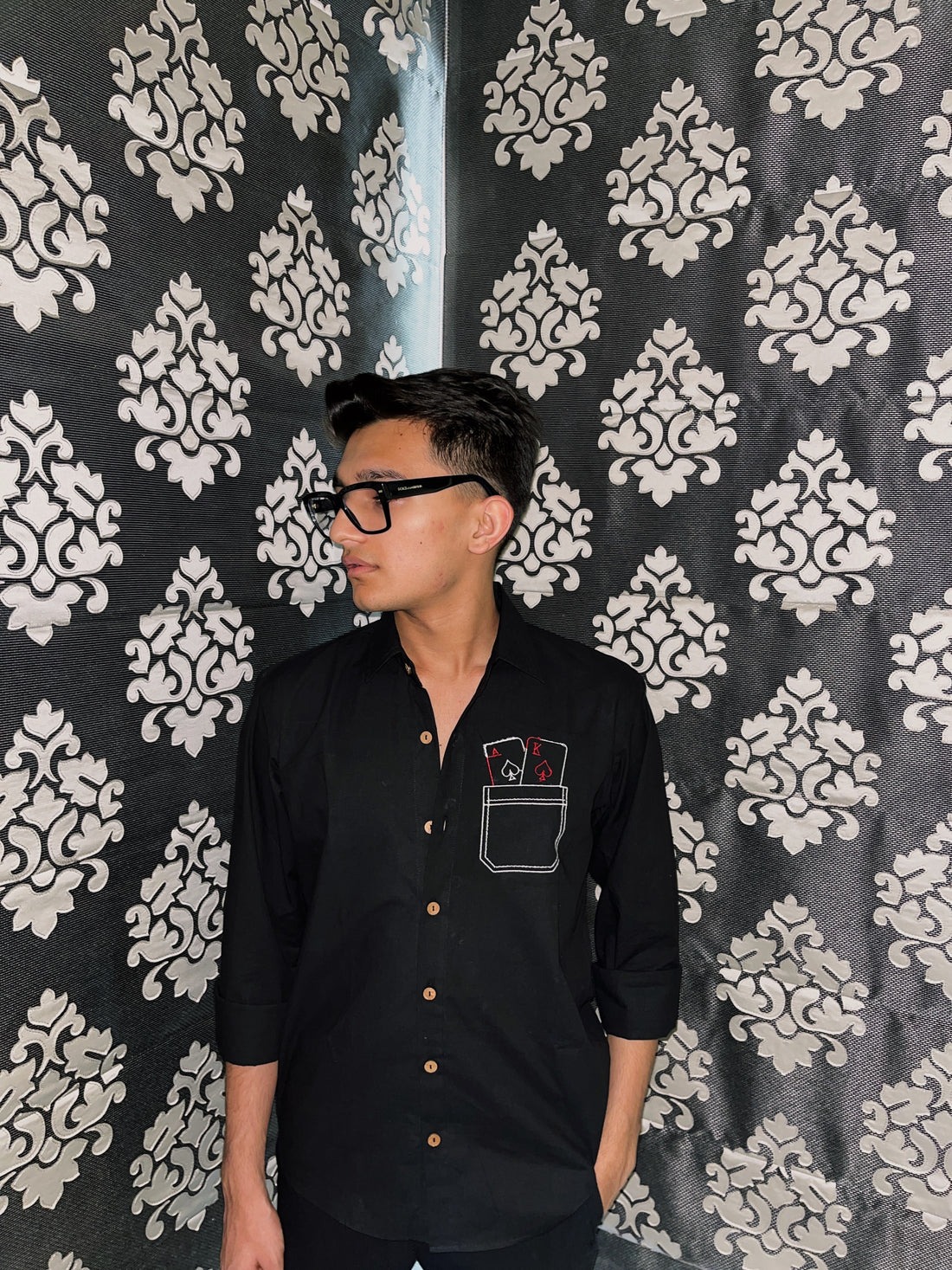 Where playful design meets effortless style. This deep black button-down shirt boasts a unique pocket...