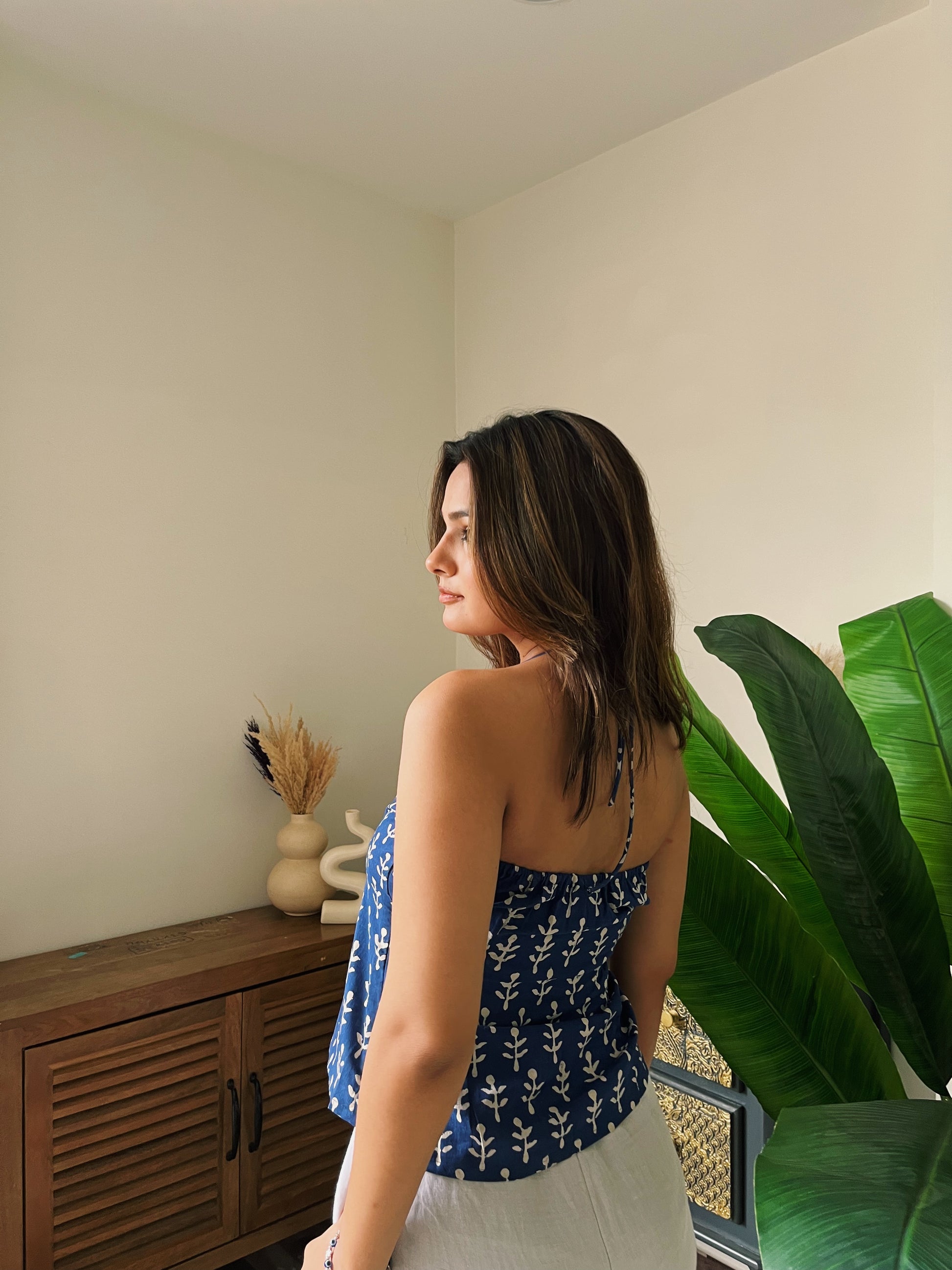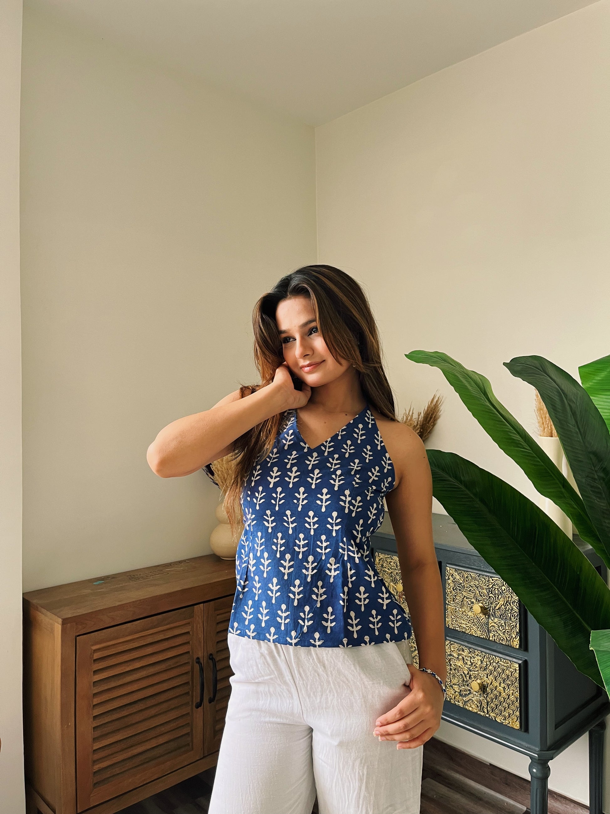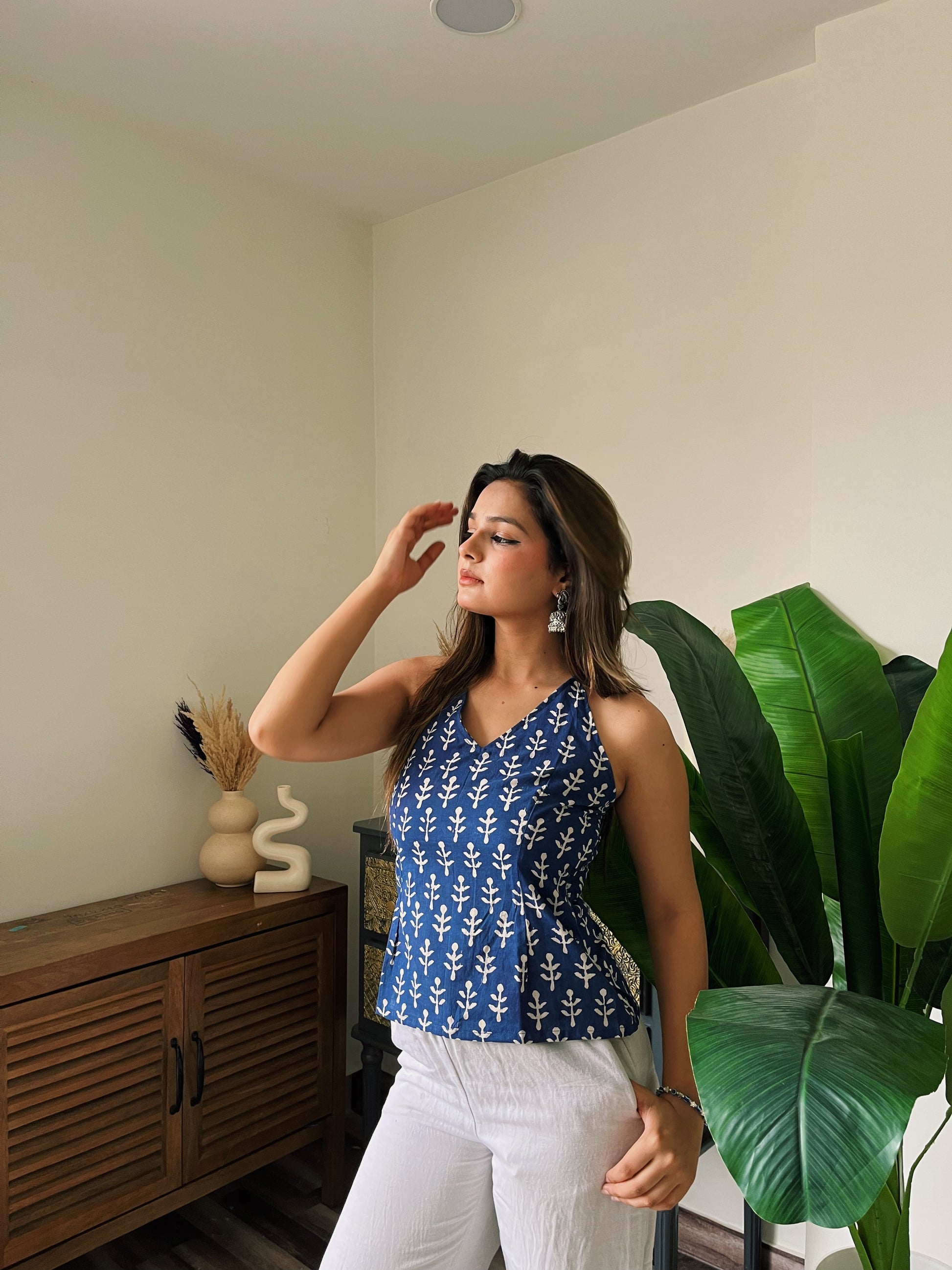 Our hand-block inspired cotton tops are designed to make summer dressing effortless. Crafted in soft cotton with delicate stripes and floral motifs, each piece features a flattering halter neckline and an easy, relaxed fit. Pair it with white trousers, denims, or your favorite linen bottoms — it’s the perfect blend of comfort and style for everyday wear.