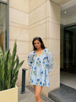 Step into effortless elegance with this breezy blue floral striped mini dress. Featuring a flattering V-neckline and billowy long sleeves, this dress perfectly balances comfort and style. The vibrant blue floral motifs over classic white and blue stripes add a fresh and playful touch, making it ideal for brunches, vacations, or casual day outings. The back showcases a subtle smocked detail for a comfortable fit, while the relaxed silhouette ensures ease of movement. Pair it with sandals or sneakers for a chic, laid-back look.
