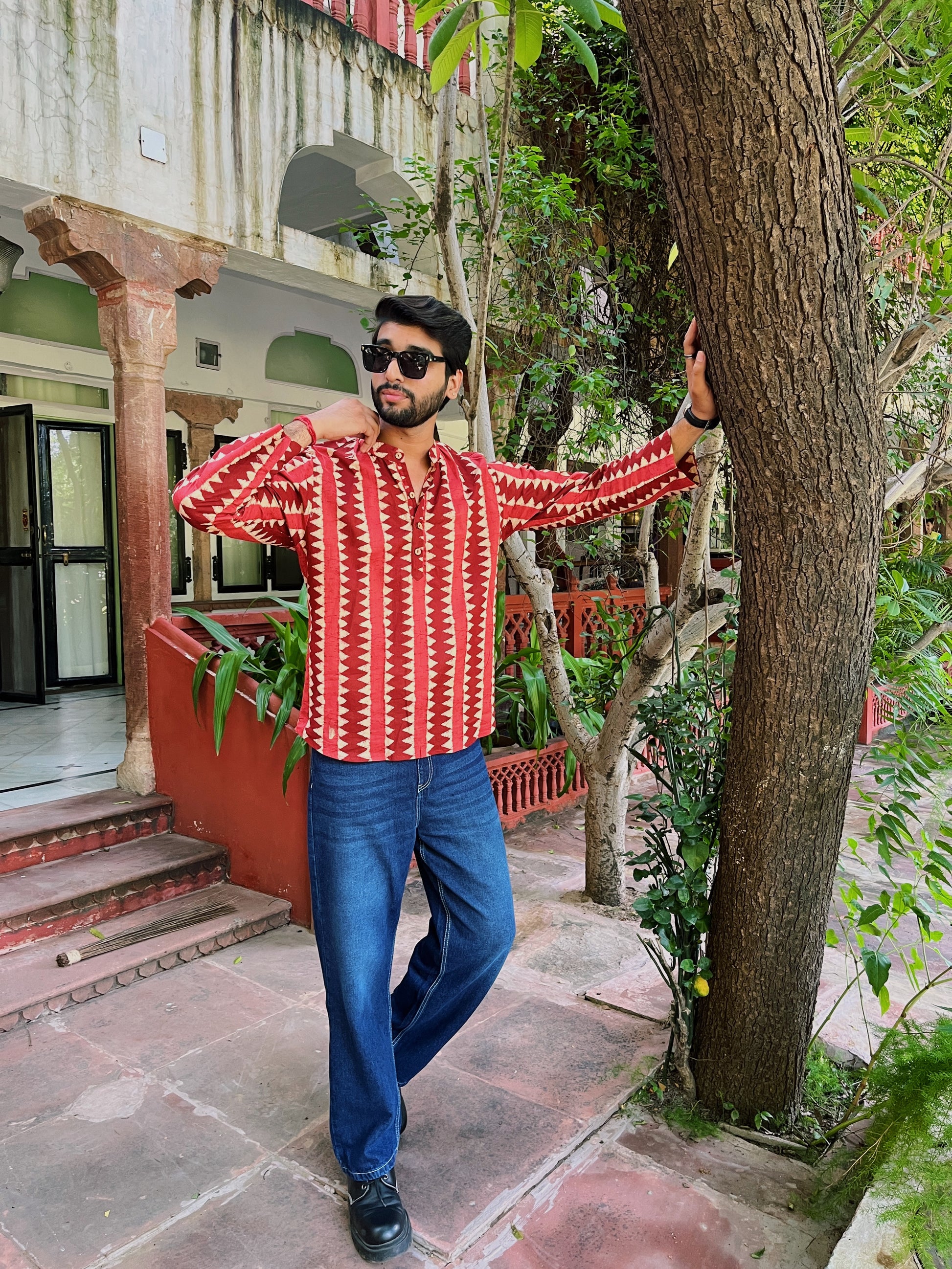 A short kurta crafted from cotton fabric, featuring a screen print design, mandarin collar, and a V-shaped neckline, with full-length sleeves, and a curved hem.