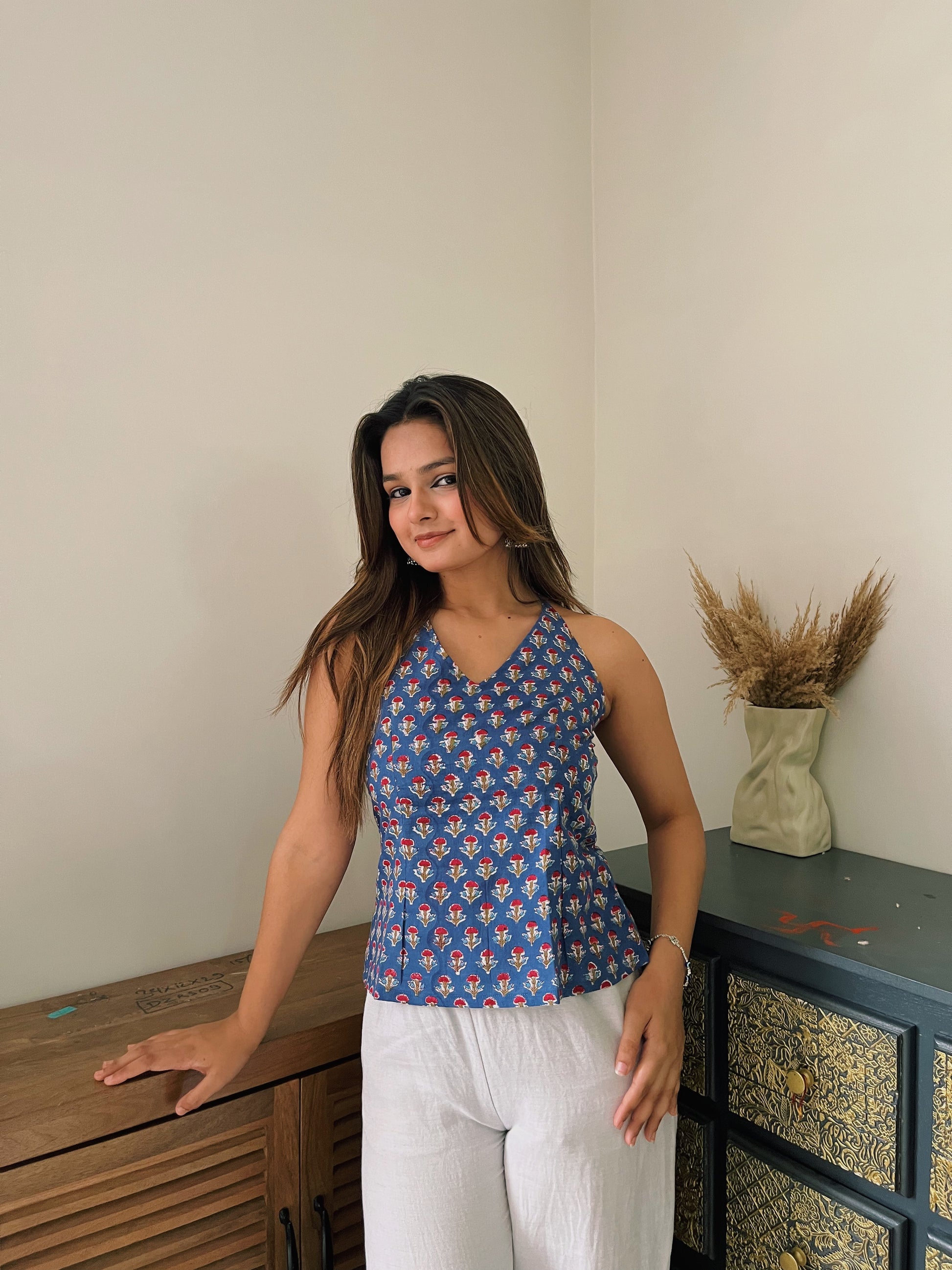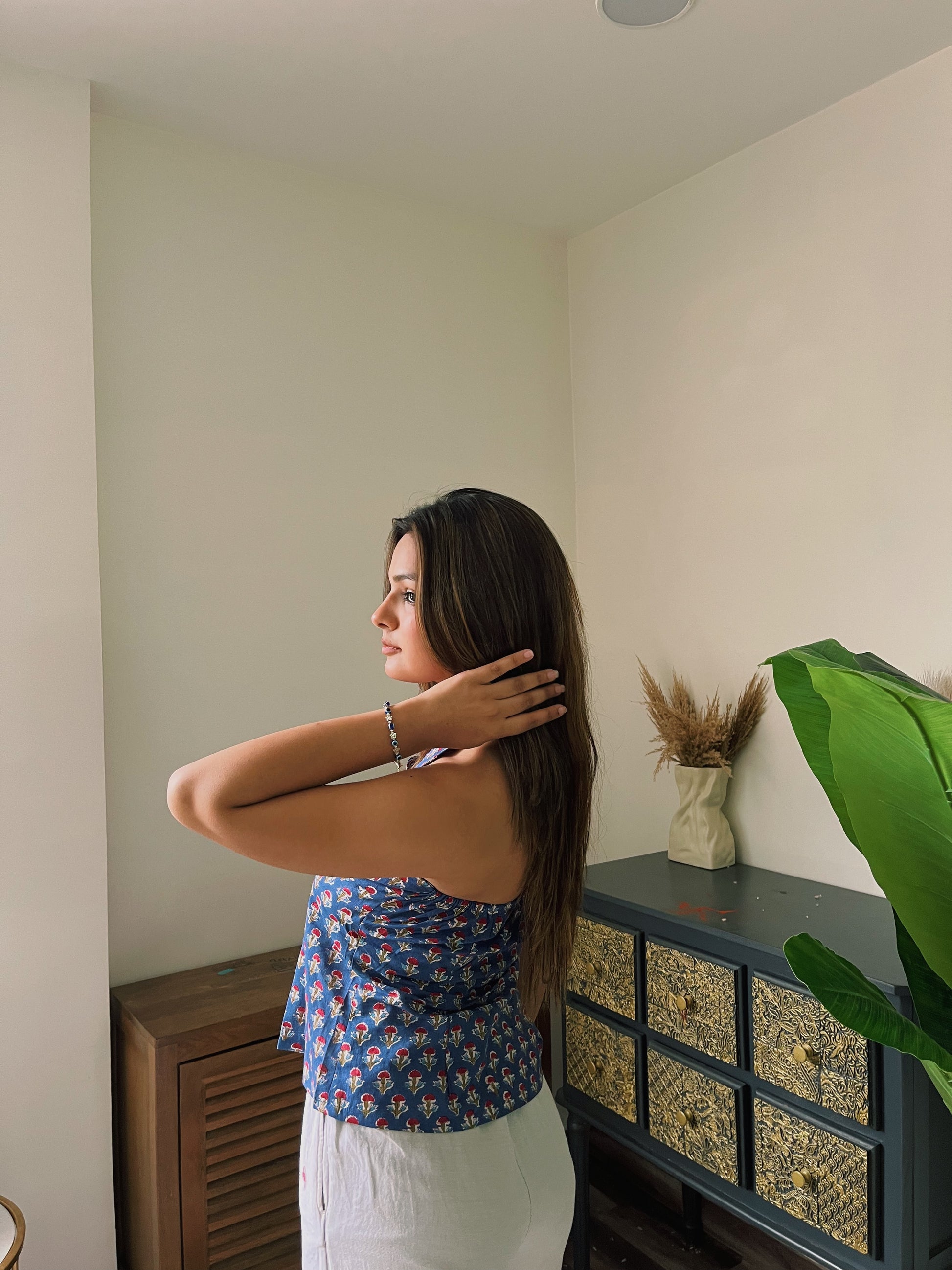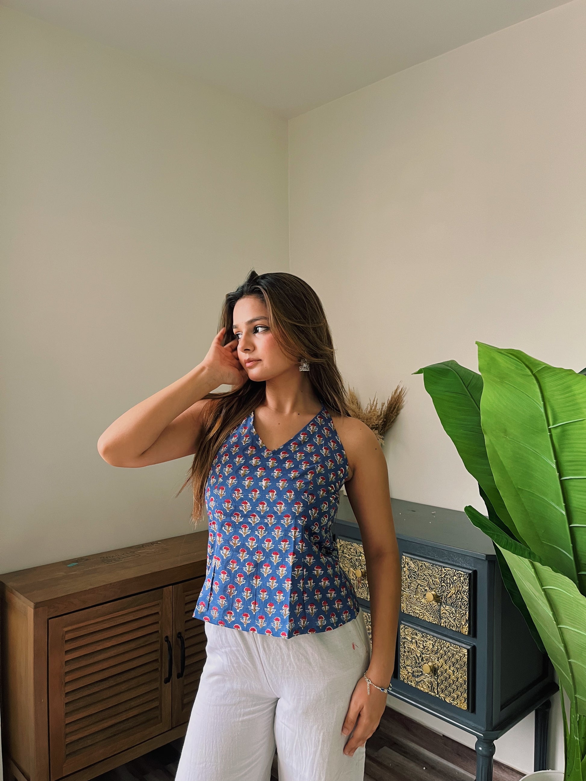 Our hand-block inspired cotton tops are designed to make summer dressing effortless. Crafted in soft cotton with delicate stripes and floral motifs, each piece features a flattering halter neckline and an easy, relaxed fit. Pair it with white trousers, denims, or your favorite linen bottoms — it’s the perfect blend of comfort and style for everyday wear.
