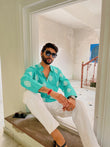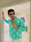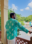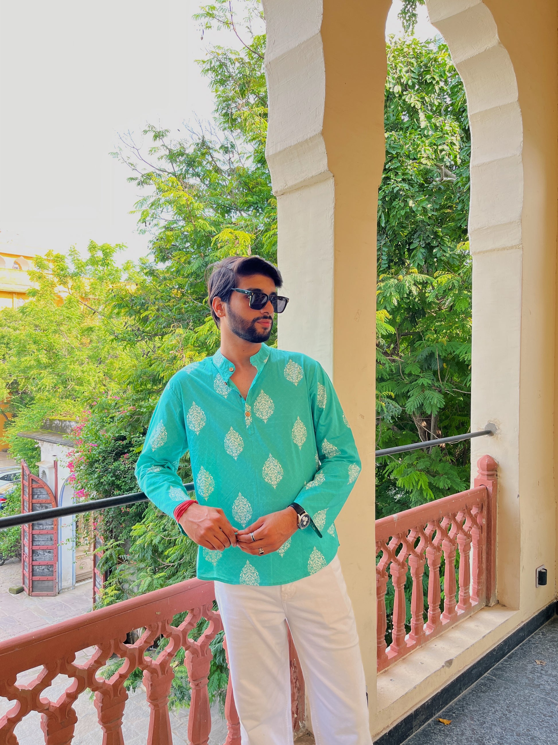 A short kurta crafted from cotton fabric, featuring a screen print design, mandarin collar, and a V-shaped neckline, with full-length sleeves, and a curved hem.