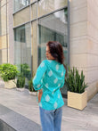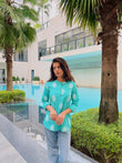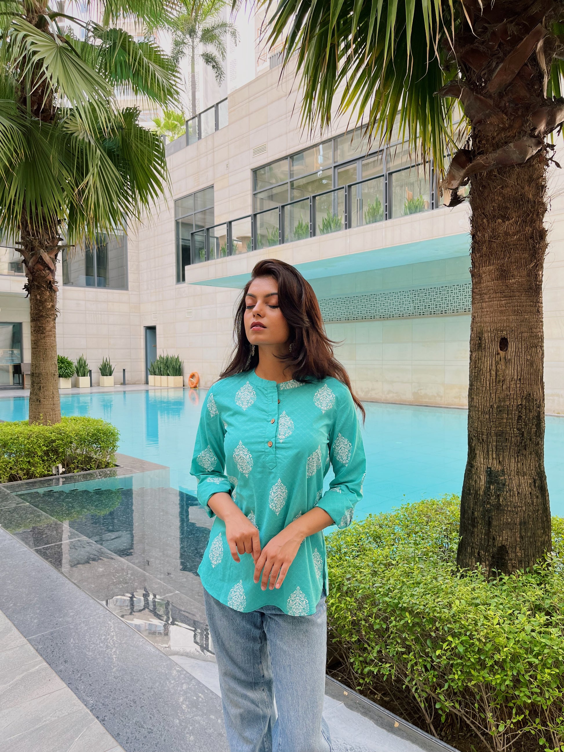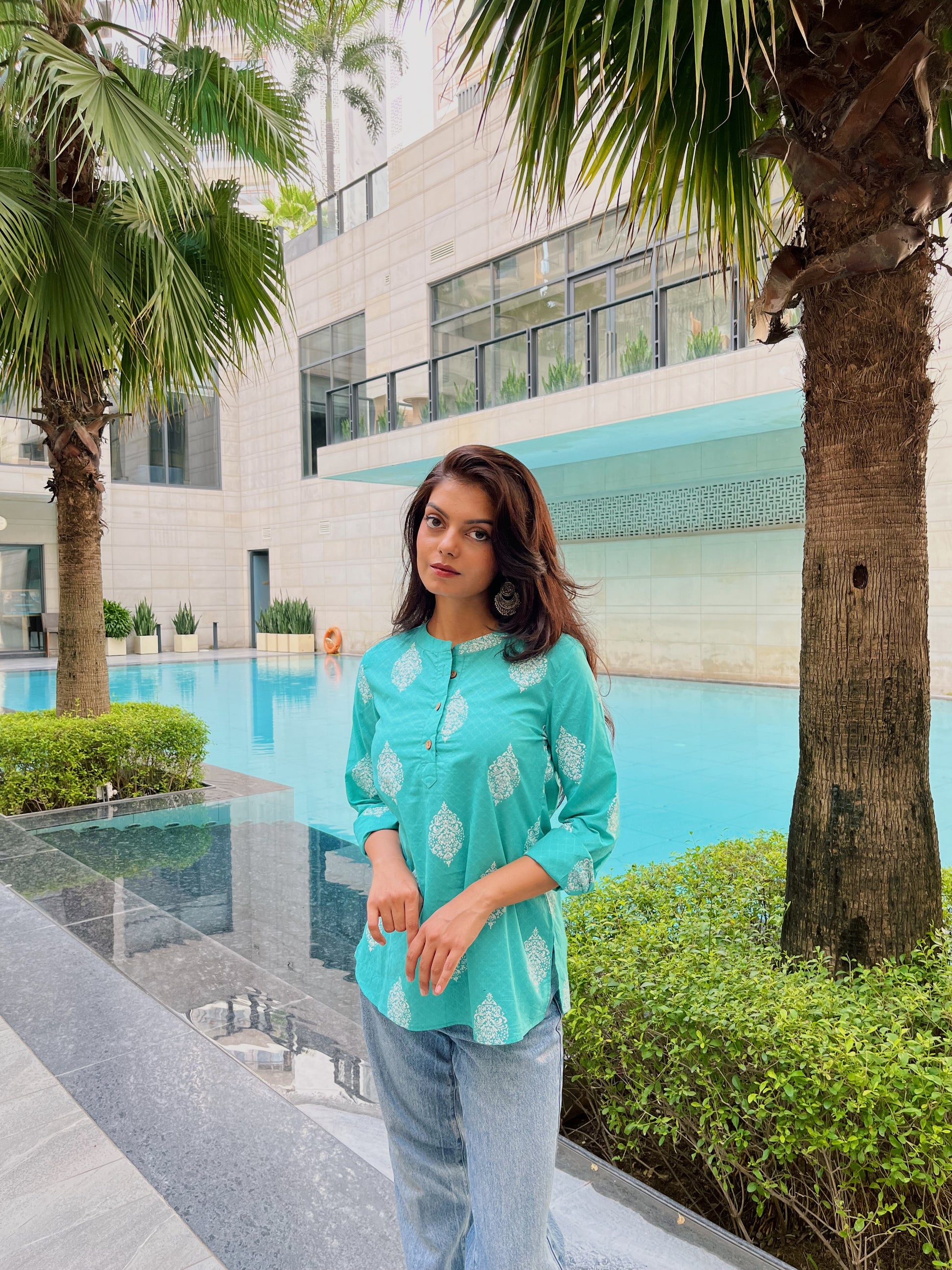 A short kurta crafted from cotton fabric, featuring a screen print design, mandarin collar, and a V-shaped neckline, with full-length sleeves, and a curved hem.