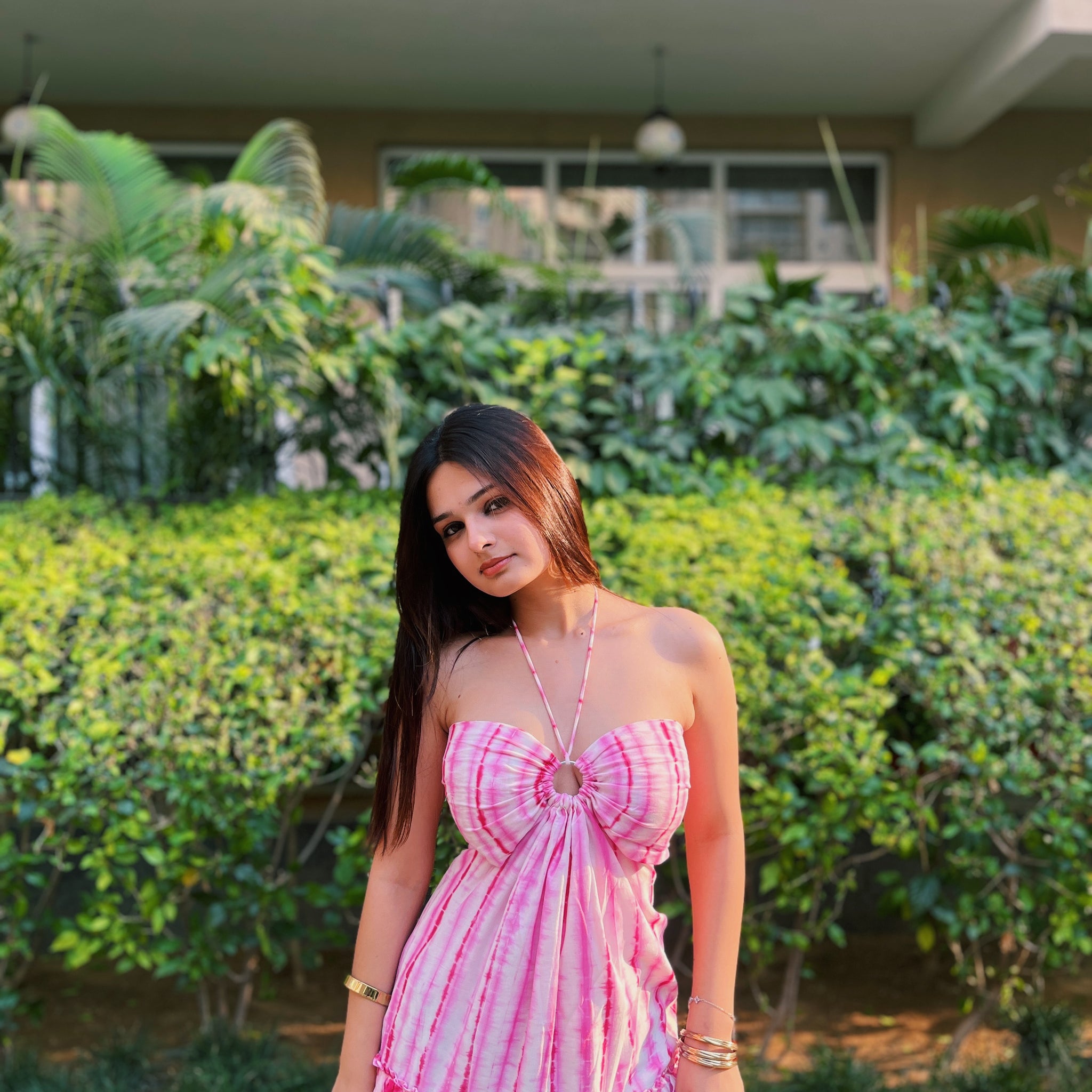 A soft and flowy maxi dress in pink and white tie-dye. Designed with a strapless sweetheart neckline, halter tie, and subtle side cut-outs. Great for a relaxed summer day or a casual vacation look.