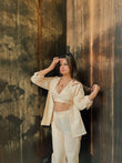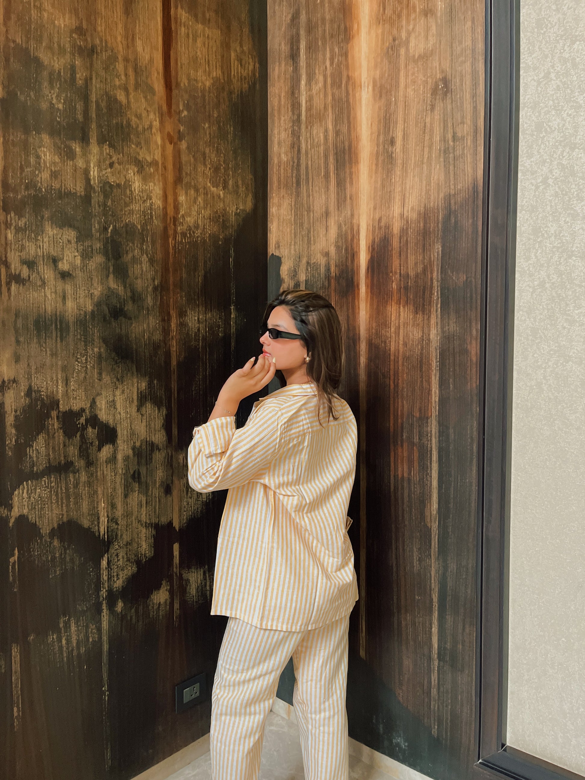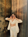 A breath of fresh air in soft Sunshine Stripes, this relaxed-fit co-ord set is perfect for effortless summer styling. The set features a breezy open shirt, a wrap bralette, and easy-fit trousers—ideal for beach days or city escapes.